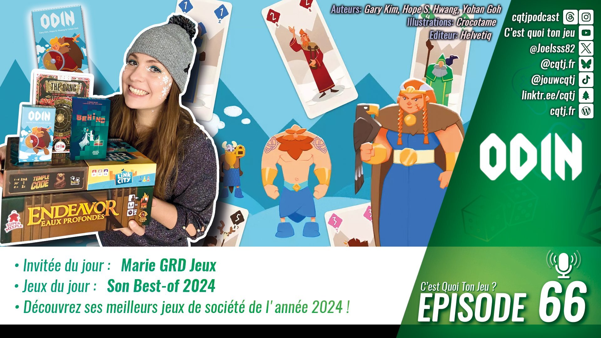 Et on commence aujourd'hui, accompagnée de Marie GRD Jeux, comme les années précédentes qui va mettre son expertise du jeu de société à profit et nous révéler quel est son meilleur jeux de 2024 mais aussi nous faire une sélection des incontournables qui ont marqué son année parmi plus de 600 jeux. Alors plongez avec nous dans cette émission particulière et partons découvrir Odin de chez Helvetiq, Link City de chez Bandjo!, The Gang de chez iello, Temple Code de chez Bankiiiz Editions, Endeavor Eaux Profondes de chez Super Meeple et enfin Behind de chez KYF Edition. Venez écouter ses recommandations et découvrir ses pépites de l'année qui ne manqueront pas, à coup sûr, de vous faire passer d'agréable moments !