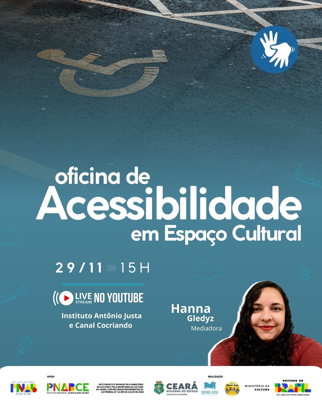 OFICINA de acessibilidade em espaço cultural. Palestrante: Hanna Gledyz. Mediação e direção técnica: Ariádila Matos. Supervisão de live streaming: Edvander Pires. Maracanaú: Biblioteca Comunitária Sonho Azul: Instituto Antônio Justa; Fortaleza: Cocriando na Podosfera, 2025. Podcast.
